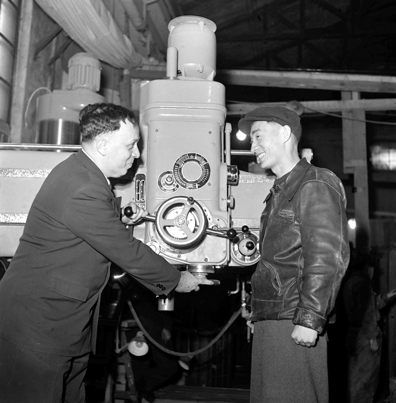 1956年,邹家华同志在沈阳和苏联专家检查生产出来的摇臂钻。