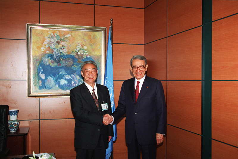 1996年6月3日至14日,联合国第二次人类住区大会在土耳其伊斯坦布尔举行。这是6月12日,邹家华同志与时任联合国秘书长加利握手。