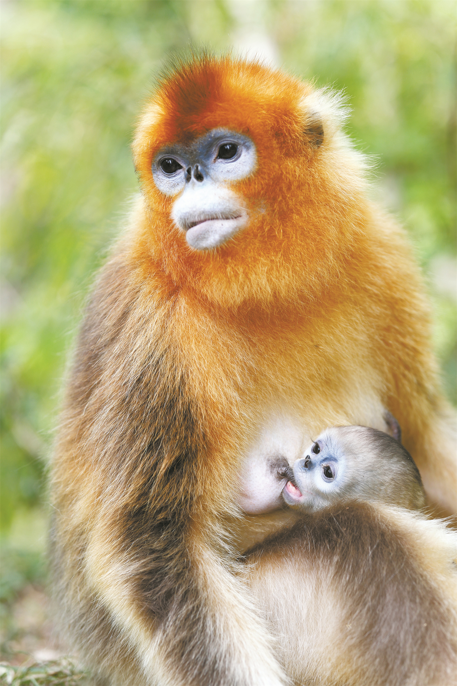 分布在秦岭地区的金丝猴是川金丝猴秦岭亚种。它们鼻孔向上仰,颜面部为蓝色,因此也称仰鼻猴、蓝脸猴,常常活跃在海拔2000—2800米的针阔混交林地带,过着群居生活。金丝猴家族长幼有序、尊老爱幼,寻得野果之类的美味佳肴,必让家长大公猴、幼猴先食,余下的方才分食。若谁敢不遵守猴规,定会受到家法的严惩。在金丝猴的社会中,没有“猴王”之说。它们的家庭是一夫多妻制,也就是一只成年雄猴作为家长和多只雌性生活在一起并繁衍后代,组成一个家庭。多个家庭单元再聚集在一起,共同觅食、活动和休息,组成了一个大的繁殖群。金丝猴这种由单元、分队、群组、社群层层嵌套的独特社会结构,科学家们称为“重层社会”。这种社群结构是为了克服近亲交配、最大限度地获得遗传多样性。