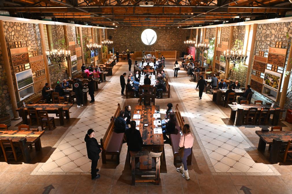 游客在宁夏银川市西夏区镇北堡镇源石酒庄品酒(2024年10月23日摄)。新华社记者 毛竹 摄