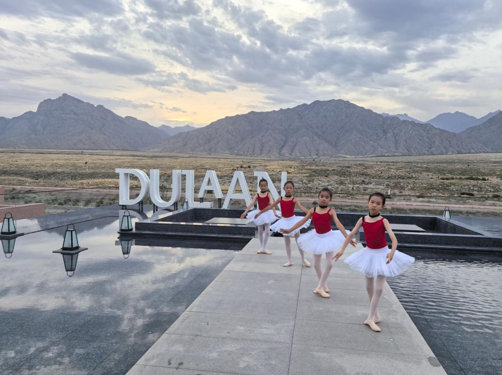 宁夏银川市图兰朵葡萄酒小镇安漠酒店观景台,游客在拍照打卡(2025年6月6日摄)。新华社记者 马丽娟 摄