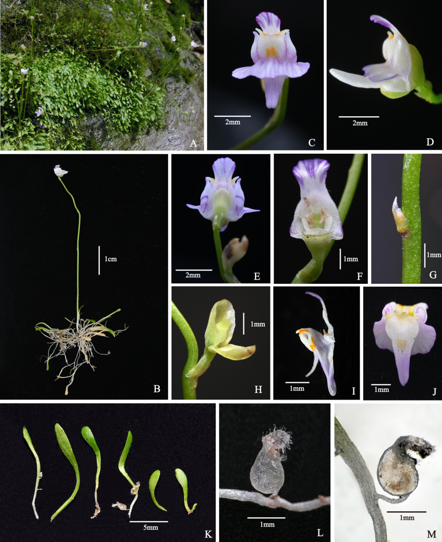 狸藻属植物作为兼性食虫植物,其叶片同时具有叶绿体进行光合作用,捕虫行为主要用于花期营养补充。其多生长在季节性积水环境,包括湿地苔藓层、山涧岩壁渗水区等生境。除了新发表的大明山挖耳草外,大明山保护区已先后监测到钩突挖耳草、合苞挖耳草、圆叶挖耳草、叉状挖耳草、挖耳草和尖萼挖耳草,共7种狸藻科植物,表明该区域为狸藻属植物的重要分布地。