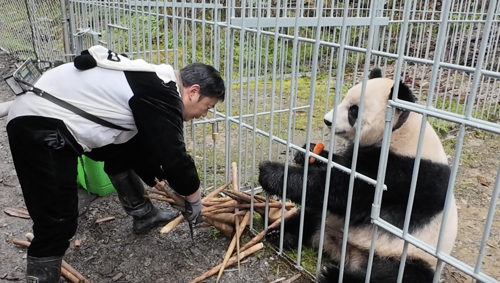 在中国大熊猫保护研究中心雅安基地的熊猫幼儿园里,饲养员肖永莉正忙碌着为双胞胎大熊猫“佳雨”“佳雪”和它们的妈妈“汪佳”备餐。她熟练地劈开竹竿,摆放好竹笋,一切准备就绪后,闸门打开,圆滚滚的大熊猫跑了出来。