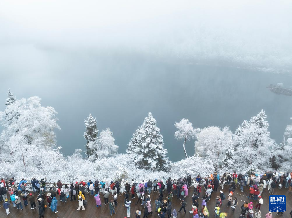 游客在九寨沟长海欣赏雪景(10月24日摄,无人机照片)。
