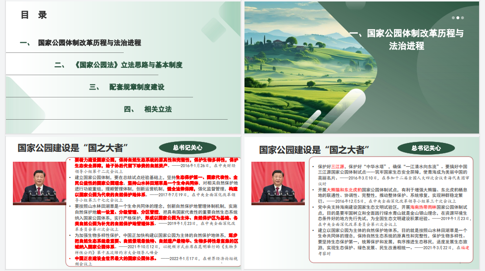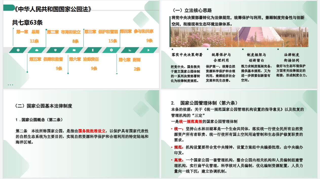 授课中,侯翎副主任围绕国家公园体制改革历程与法治进程、《国家公园法》立法思路与基本制度、配套制度建设,以及《自然保护区条例》《风景名胜区条例》等相关立法进行了深入讲解,紧扣立法主旨、核心条款、实务适用等内容对“一法两条例”进行全方位解读,授课既立足国家生态文明建设大局,又紧密结合自然保护地体系建设实际,政策性、理论性、指导性和实用性强,为全院干部职工深化理解国家公园和自然保护地建设提供了有力指导。