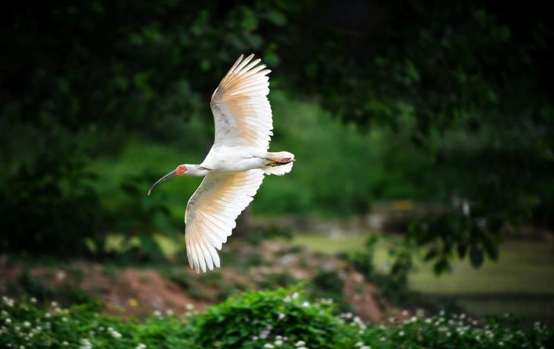 ↑这是陕西省汉中市洋县朱鹮生态园内的朱鹮(2021年5月13日摄)。