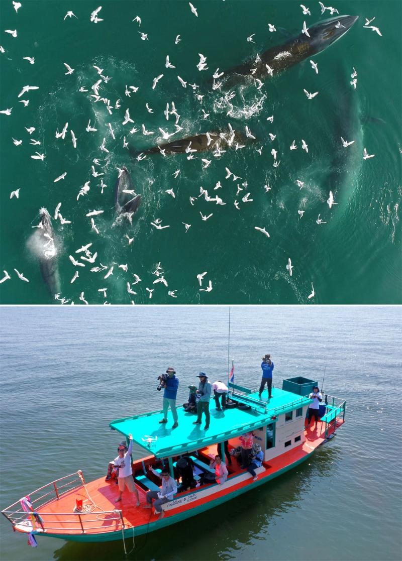 ↑(拼版照片)上图:布氏鲸在中国广西涠洲岛附近海域捕食(2022年2月22日摄)。下图:中泰两国科研人员在泰国湾对布氏鲸进行联合调查(2019年10月25日摄)。中泰两国科研人员携手研究保护布氏鲸这个近岸大型鲸类,围绕布氏鲸调查技术、调查方法以及其他海洋哺乳动物的研究和数据处理方法进行交流与合作。