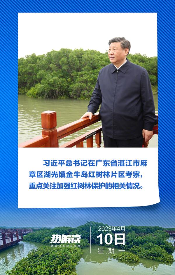 热解读 近日,习近平总书记在广东考察,这是2023年全国两会后总书记首次地方考察。4月10日,总书记在有“红树林之城”美誉的湛江考察了麻章区湖光镇金牛岛红树林片区。