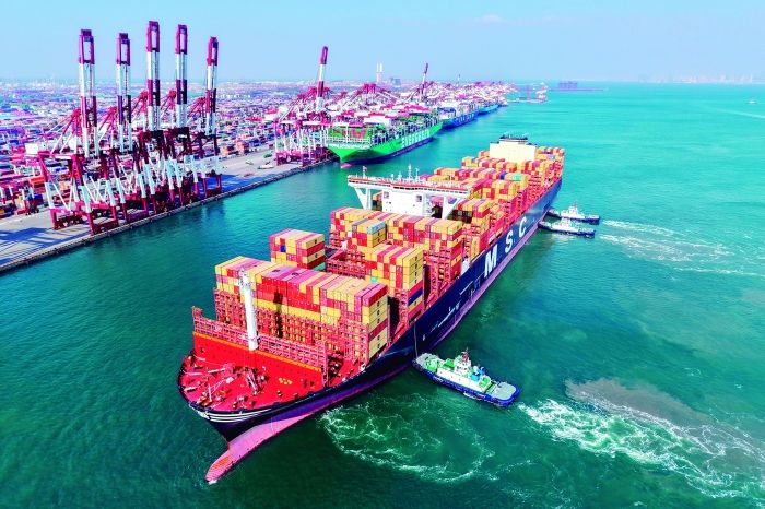 山东港口青岛港,一艘货轮在拖船辅助下停靠码头。 新华社图