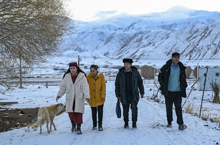 2025年1月3日,全国人大代表多来提曼·开米克(右二)在新疆塔什库尔干塔吉克自治县瓦恰乡夏布孜喀拉村走访。新华社记者 陈朔 摄