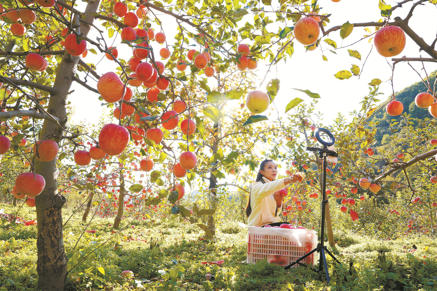 今年,河北省邢台市内丘县侯家庄乡种植的3万多亩苹果迎来丰收。果农们趁着晴好天气忙着采摘、包装、直播销售,供应市场。