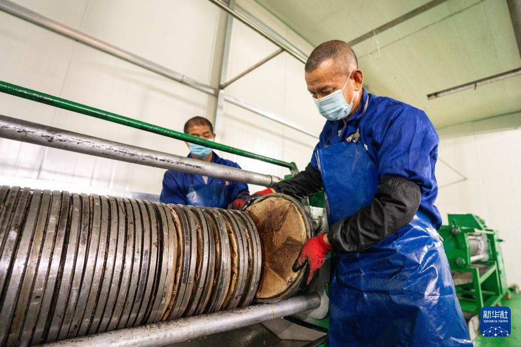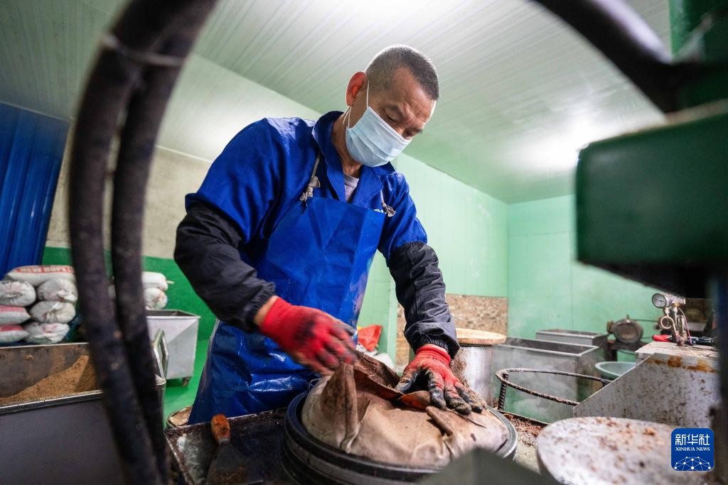 12月7日,工人在位于祁阳市八宝镇的湖南顾君茶油有限公司安装茶饼,准备榨油。