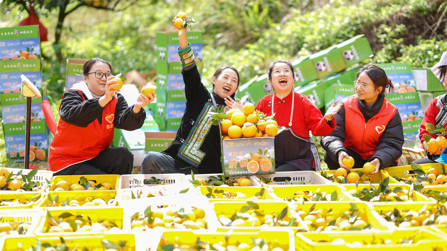近日,贵州省黔东南苗族侗族自治州榕江县4.2万亩脐橙迎来采收季。果农在党员干部、志愿者、新媒体主播等帮助下,抢抓晴好天气采摘、打包、搬运脐橙,并直播推销脐橙。