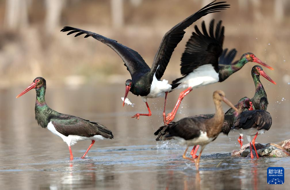 12月9日,黑鹳在河北省石家庄市平山县境内的冶河湿地嬉戏觅食。