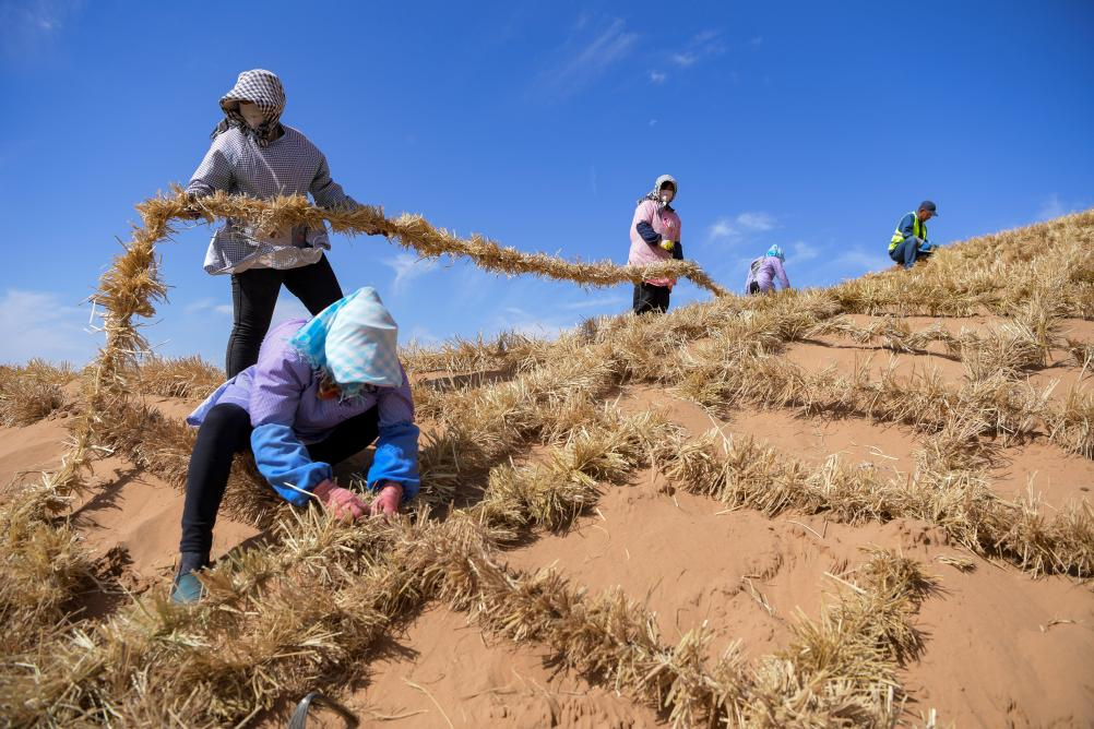 5月30日,治沙工人在宁夏中卫市境内的腾格里沙漠铺设刷状网绳式草方格沙障。新华社记者 冯开华 摄