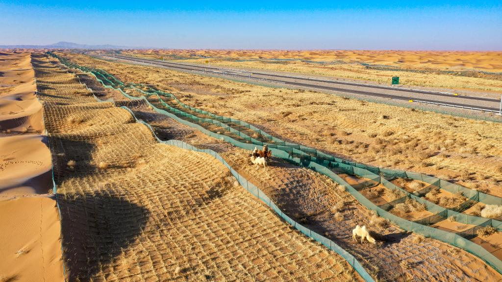 乌玛高速青铜峡至中卫段穿越腾格里沙漠的路段,两侧设置了生态防护带(无人机照片)。(资料照片)新华社记者 冯开华 摄