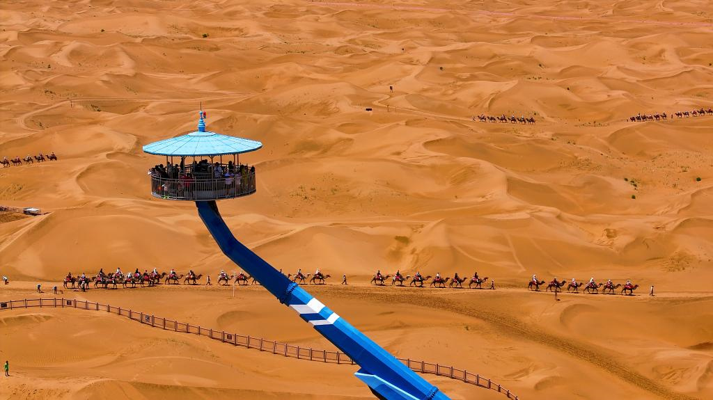 7月5日,游客在中卫市沙坡头旅游景区体验大漠飞天项目和骑骆驼(无人机照片)。新华社记者 冯开华 摄