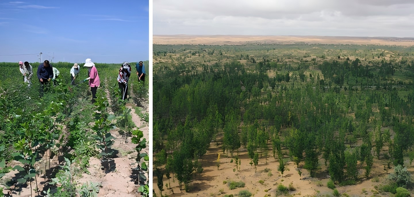 拼版照片:左图为2023年7月22日,内蒙古杭锦旗什拉召治沙站工作人员在苗圃除草;右图为2023年7月22日拍摄的什拉召治沙站种植的库布其沙漠锁边林(无人机照片)。20世纪50年代开始,国营林场什拉召治沙站开始植树治沙,三代治沙人在库布其沙漠北缘营造了长48公里、面积12万多亩的锁边林带,有效遏制了沙漠向北扩张。新华社记者 刘磊 摄