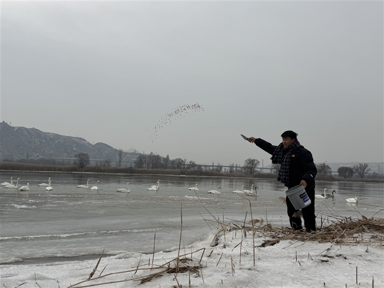 冬季一大早,如果你在天鹅滩仔细观察,会看到一名戴着口罩、身穿厚衣的年轻人,他或手提满桶新鲜玉米守在河边,或在河边默默捡拾着垃圾,或主动上前提醒人们不要大声呼叫……他便是一直默默守护着这些远方来客的当地村民——天鹅滩的守护者达朝阳。