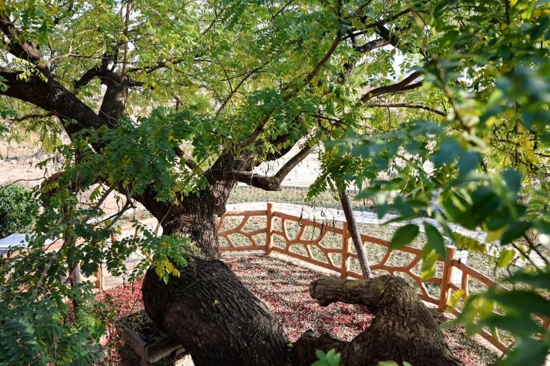 位于莱芜区高庄街道东沟里村旧址,占地400余平方米。该村居民现已整体迁至旧村南临的现代化社区生活,只留一片废弃民房及2株距今300多年的古槐,让人触景感怀。在古槐园规划设计阶段,广泛征求了居民意见,了解到附近居民喜欢自带马扎围坐树下纳凉和休闲的活动习惯后,在2株古槐间增设了舒适的木质休闲平台。通过增加透气孔、铺设树皮覆盖物、设置防护围栏及树体支撑、加设避雷针等措施,对2株古槐进行保护复壮。栽植适生苗木进行环境绿化提升,构建以古槐园为中心的社区文化活力空间。