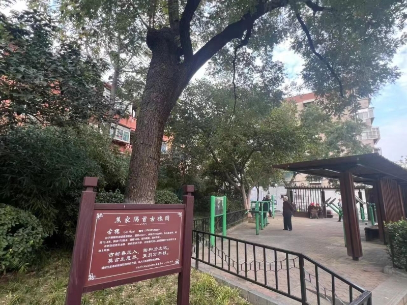 位于天桥区制锦市焦家隅首邮政宿舍三角绿地内,占地480平方米。此处古槐树龄已有110余年,见证了民国至今制锦市的历史变迁,承载着几代制锦市人的时代记忆。制锦市小区是济南早期建设的人员较为密集的大型社区,交通狭窄、拥堵,居民活动空间非常有限。今年,结合老旧小区改造提升,重新调整了古槐周边绿地空间,对破损严重的花架、座椅、护栏等设施进行了修缮和更新,保障了市民最基本的休闲健身需求。增加开花植物,对现有苗木进行梳理和整形修剪,进一步提升古树生存环境。增设古树宣教设施,通过引用古诗词的形式传诵古树文化,进一步增强居民的古树保护意识。