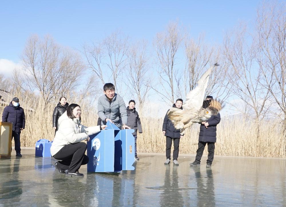 1月7日,在野鸭湖野生动植物保护救助中心,野鸭湖鸟类环志监测站揭牌成立。当天,在佩戴环志、卫星定位监测设备后,五只此前获救具备放飞条件的灰鹤、大鵟等野生鸟儿被放飞到大自然中。