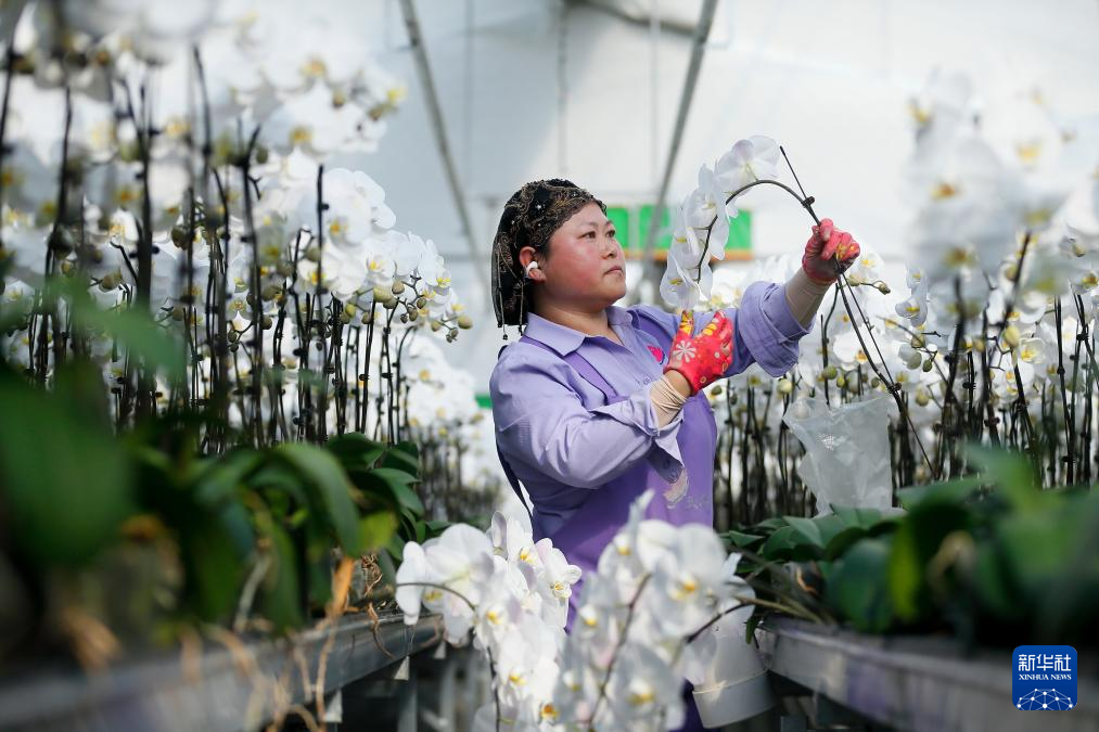 早春时节,在山东省平度市旧店镇万汇蝴蝶兰产业园,智能花卉温室里大片蝴蝶兰盛开,工人们忙着管护和加工鲜切花,供应国内外市场。近年来,平度市旧店镇大力发展蝴蝶兰种植,打造集组培育苗、现代化种植、研学及观光于一体的智慧农业产业园区,年产鲜切花300余万枝。花卉产业还带动当地200多人就业,促进农业增收,助力乡村振兴。新华社发(梁孝鹏摄)