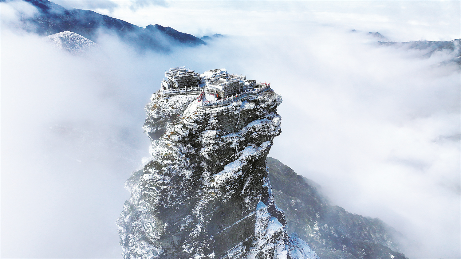 受低温天气影响,贵州梵净山景区日前迎来一场洋洋洒洒的春雪,皑皑白雪把红云金顶、老金顶、蘑菇石等景点装扮成了粉妆玉砌的童话世界,吸引众多游客前来赏雪游玩。
