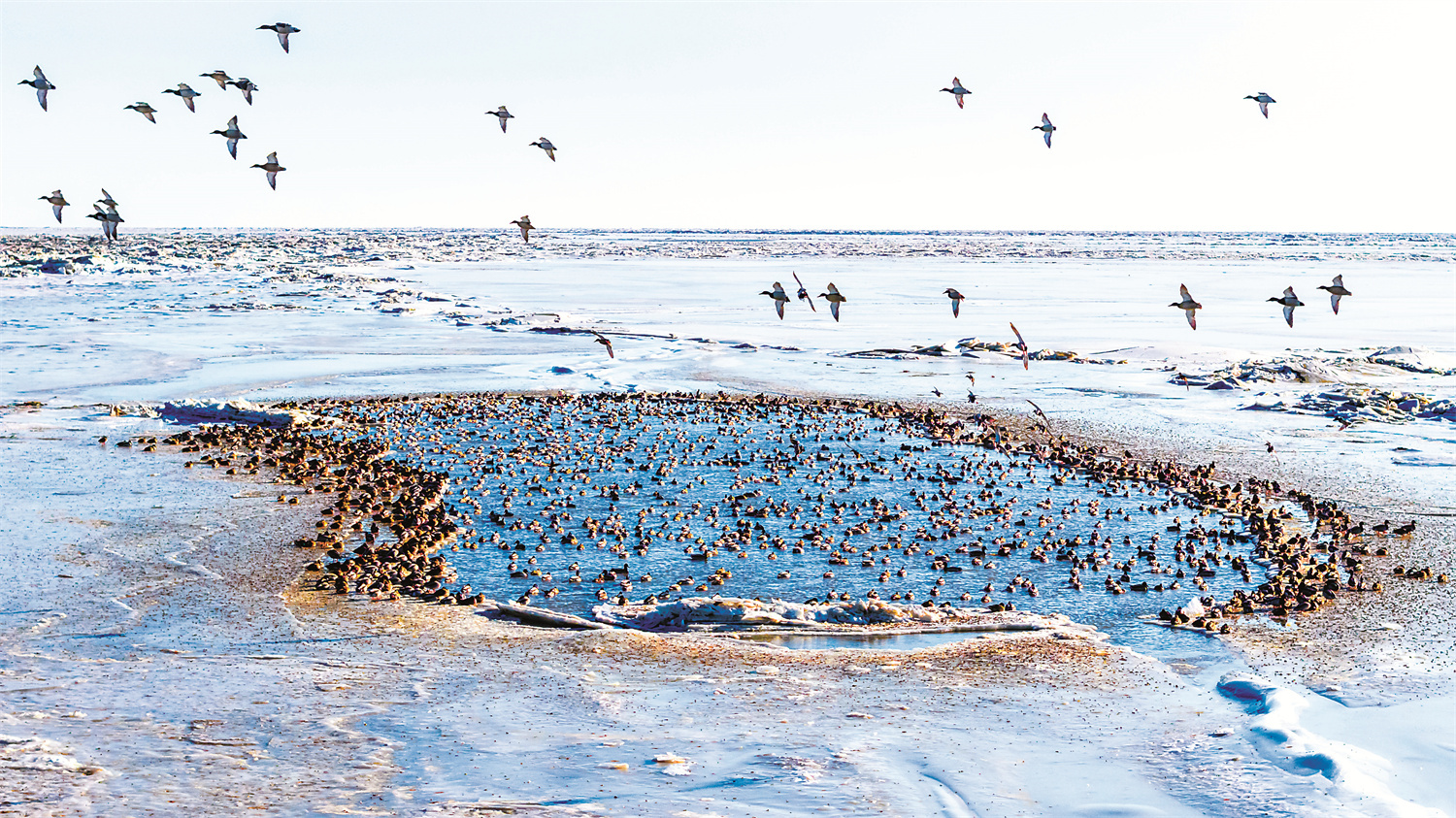 2月2日,辽宁辽河口国家级自然保护区的冰封滩涂上,一汪未冻的水域荡漾着粼粼波光,数千只绿头鸭聚于此间,或低头啄食、或振翅嬉戏、或悠游水面,为料峭冬日的湿地绘就一幅灵动的迎春画卷。