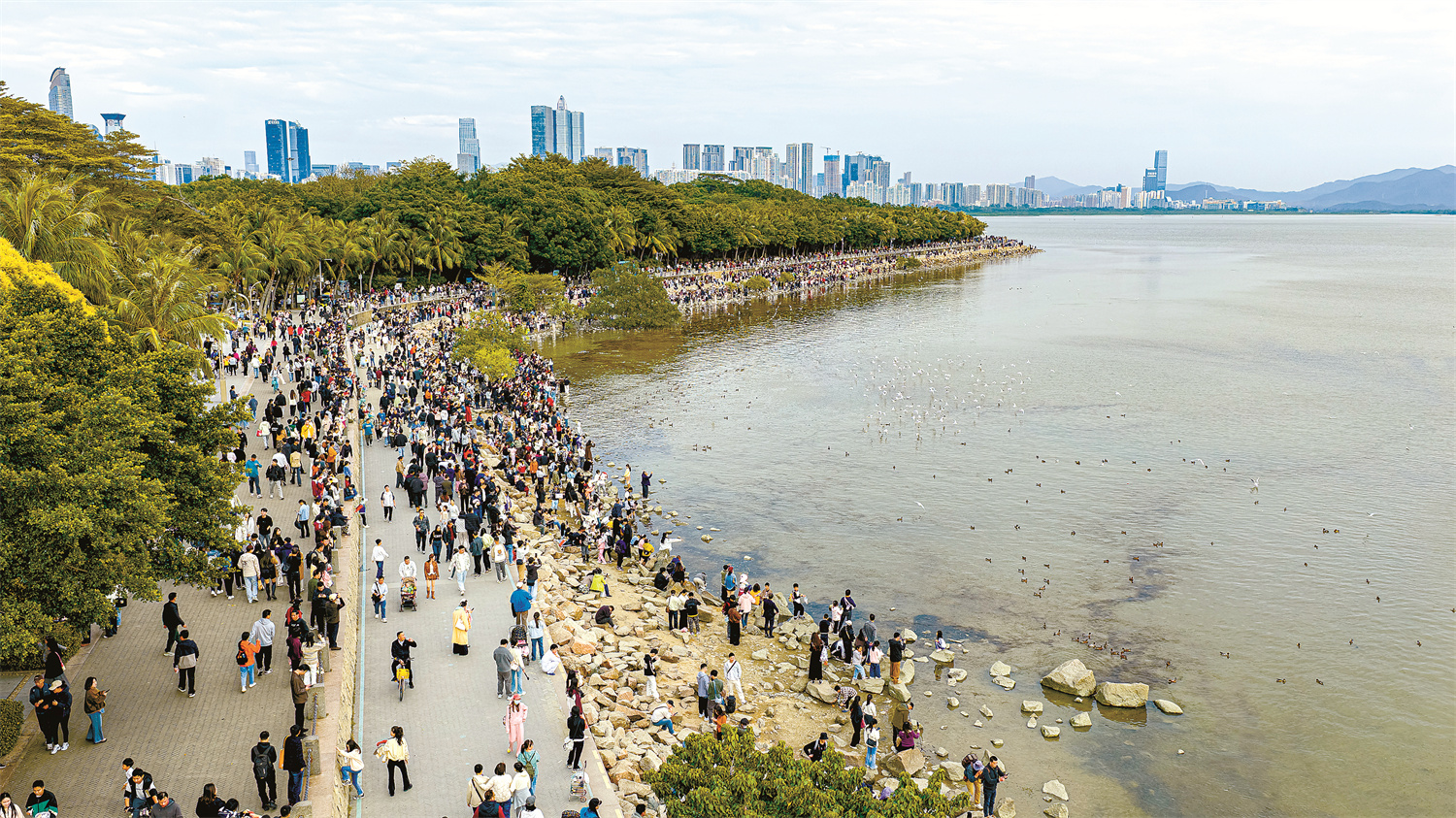 12月14日,深圳湾公园迎来观鸟热潮,数万市民与数万只越冬候鸟齐聚海岸线,展现出一幅人鸟和谐相处的生动图景。
