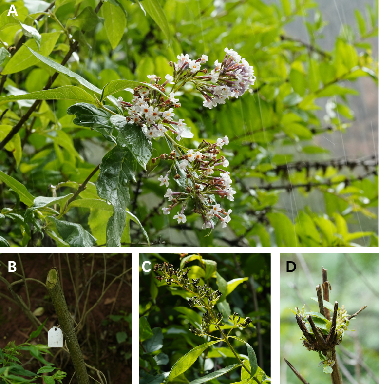 受威胁的腺叶醉鱼草 图版 A:雨中开放的腺叶醉鱼草;B:被砍伐的植株;C:败育的花序;D:被啃食的枝条