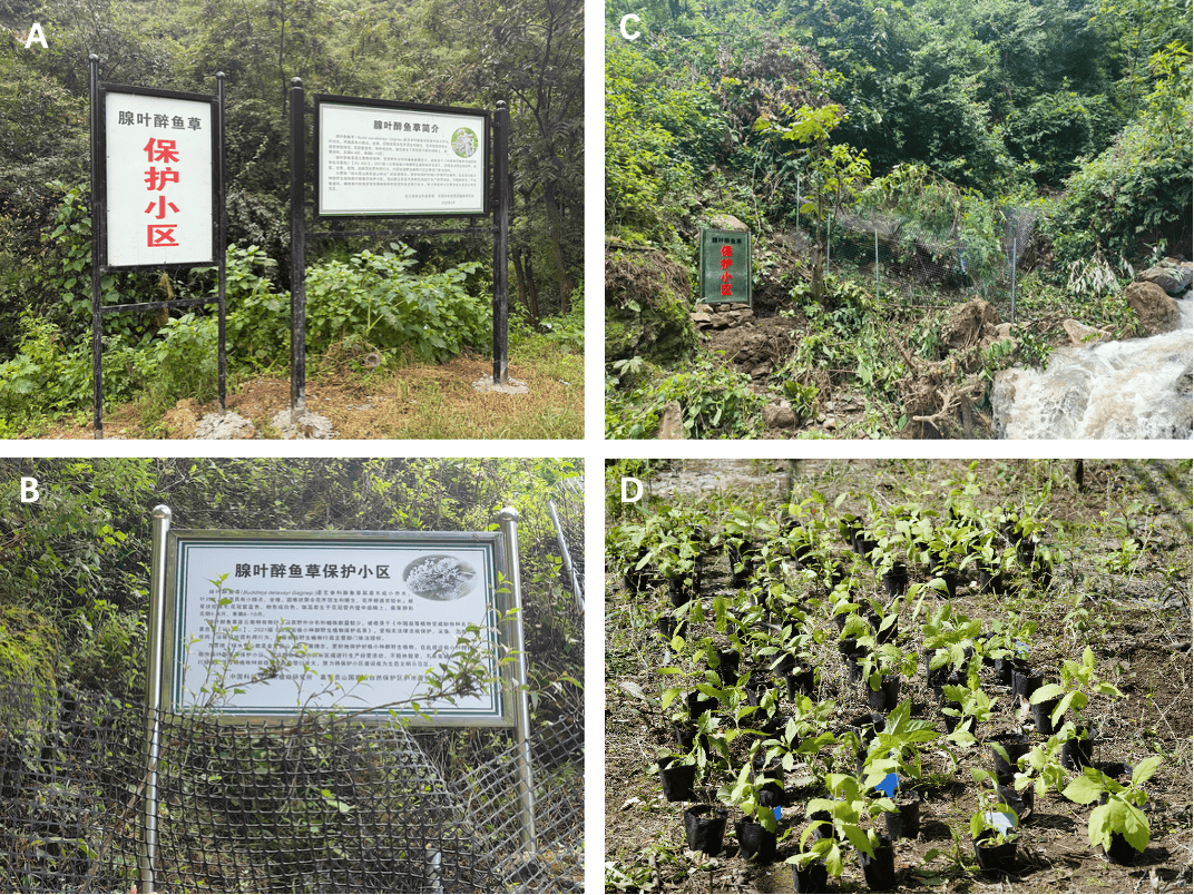 腺叶醉鱼草保护行动 图版 A:剑川县三河村腺叶醉鱼草保护小区;B、C:泸水市白水河村保护小区;D:姚家坪片区迁地保护的腺叶醉鱼草