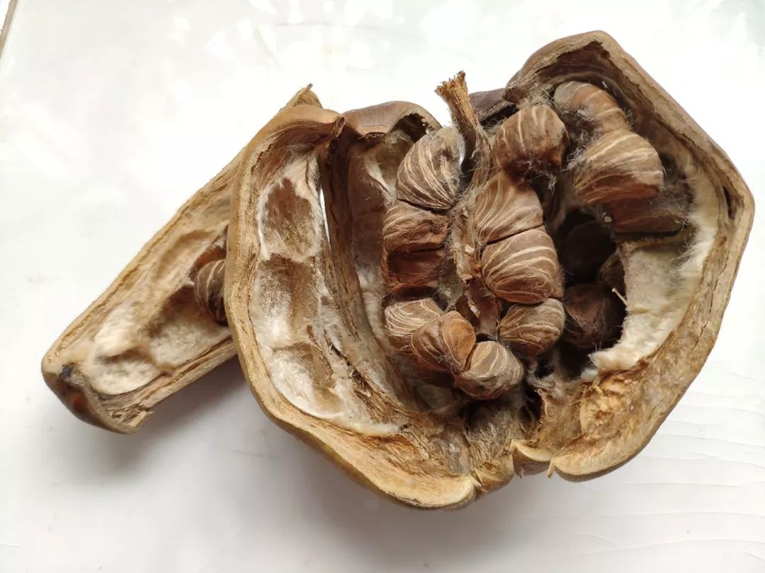 花后发财树会结出椭圆形的果实,形状有点像木瓜,而里面的种子则有点像栗子,这可能正是“瓜栗”这个名称的来源——而且发财树的种子还真和栗子一样,煮熟就可以吃,味道也差不多。发财树的果实成熟后会自己开裂,果皮内壁毛茸茸的有很多细小的棉毛,这也是它和木棉有亲缘关系的证据之一。