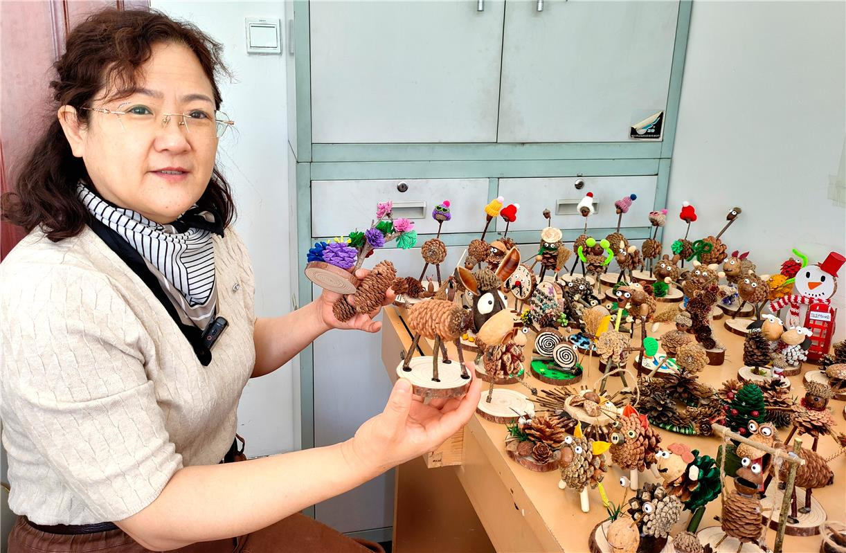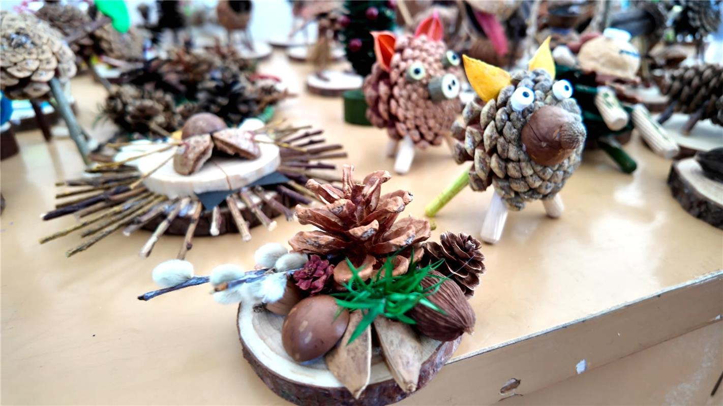 球果文创区创意满满,落叶松球果、枯树枝、果壳等原生态素材整齐摆放,职工们巧手雕琢,让林间废料变身文创精品。憨态可掬的小毛驴、灵动可爱的小熊、惟妙惟肖的猫头鹰等造型栩栩如生,每一件作品都源自林区自然景致与职工生活的灵感碰撞,既饱含浓郁林区特色,又兼具人文艺术气息,体现自然之美与人文创意的深度融合。