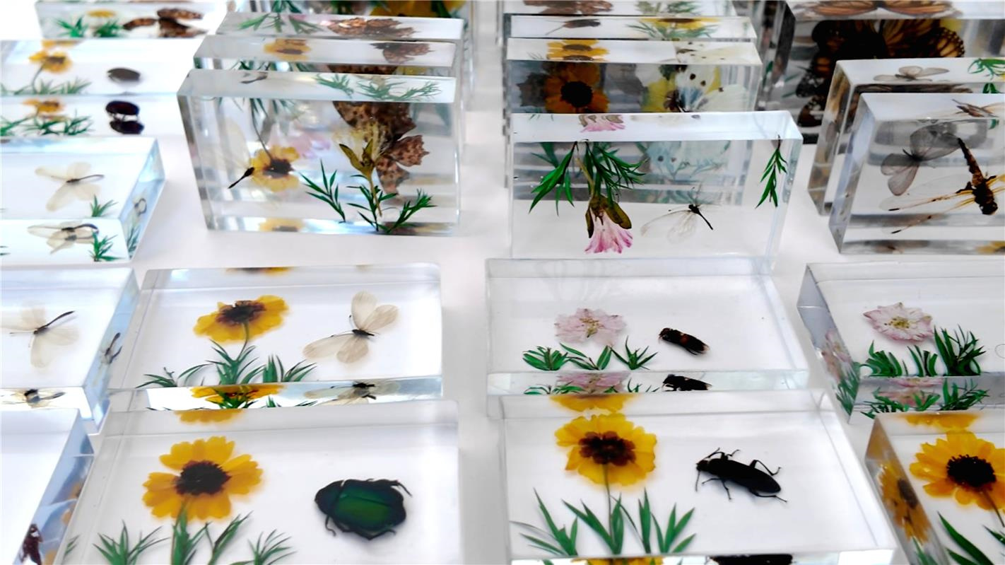 制作现场分工明确、井然有序,分为树脂标本文创与球果文创两大创作区。创新工作室工作人员依托去年研发的新型树脂标本包埋技术,巧用库存标本资源,严格把控称量、配比、包埋、固化、打磨全流程,将林区各类昆虫、花草标本镶嵌其中,成型的树脂标本晶莹剔透、鲜活逼真。