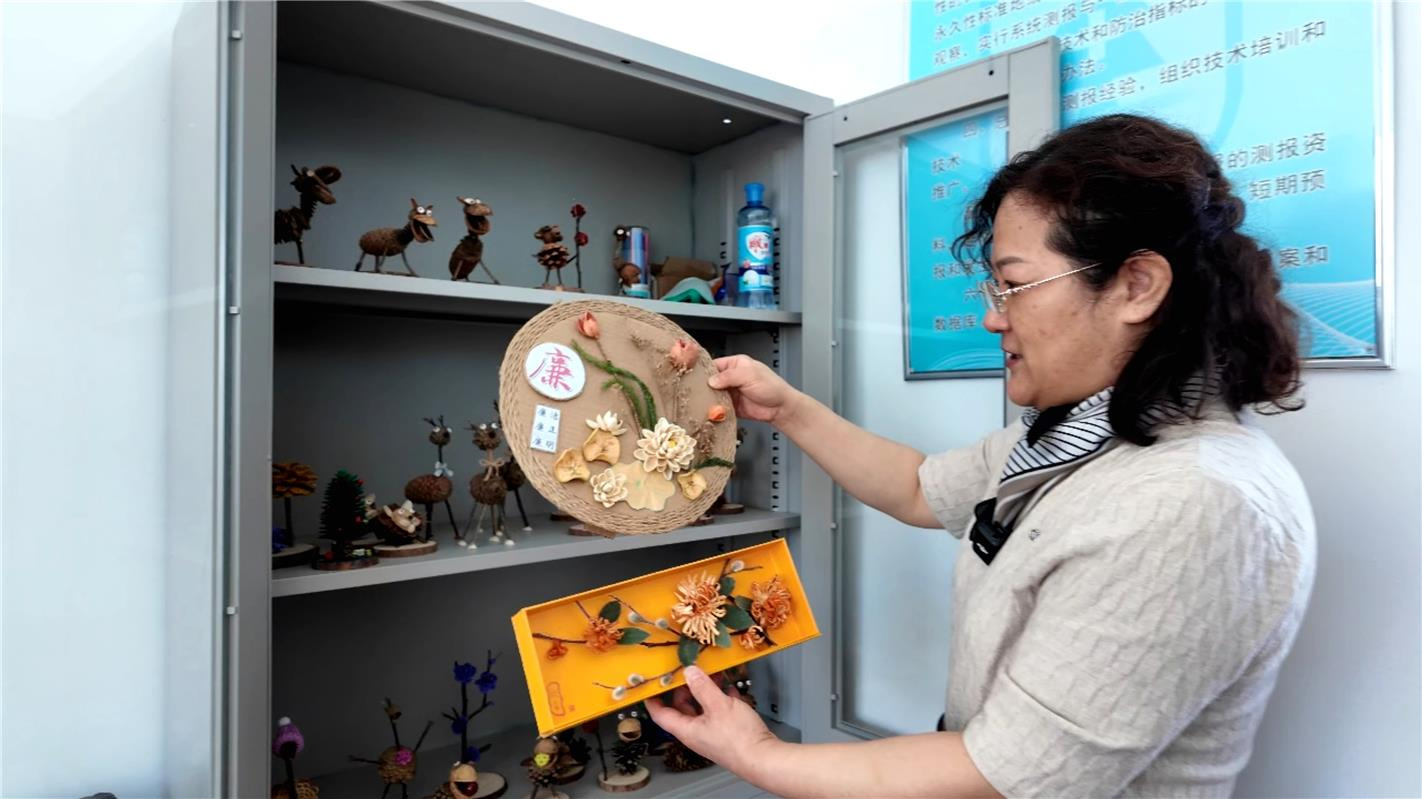 测报员李明映兼顾两项文创制作,他坦言树脂标本制作工艺严苛,团队坚持库存标本复用、剩余胶体二次利用,真正做到物尽其用、绿色创作;测报员李雅琴常年深耕森防一线,擅长从林间素材挖掘灵感,边学边做、边做边创,从日作两三件到日完成8件,个人已独立完成70余件特色文创,件件藏着浓浓的林区情怀。新入职员工张哲则主打温情创作,成对造型的文创作品细腻暖心,尽显巧思。