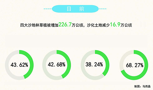 经过多年治理,目前,毛乌素、浑善达克、科尔沁和呼伦贝尔沙地的林草植被增加226.7万公顷,沙化土地减少16.9万公顷,平均植被覆盖度分别达到43.62%、42.68%、38.24%和68.27%,实现了生态整体改善。