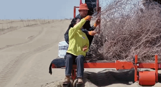 种树机在当地普遍推行,只需要将树苗插到开沟器开出的沟里,滴灌带同步铺设,像这样的一台双轨种树机,一天就可以种下13000多棵树,效率比传统的方式高了10倍以上。