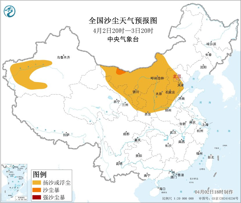 根据中央气象台4月2日18时继续发布的沙尘暴蓝色预警:受冷空气大风影响,预计4月2日20时至3日20时,新疆南疆盆地、内蒙古中西部、甘肃中东部、宁夏、陕西中北部、山西、北京中西部、天津中西部、河北中南部、河南北部等地的部分地区有扬沙或浮尘天气,其中,内蒙古西北部等地局部有沙尘暴。