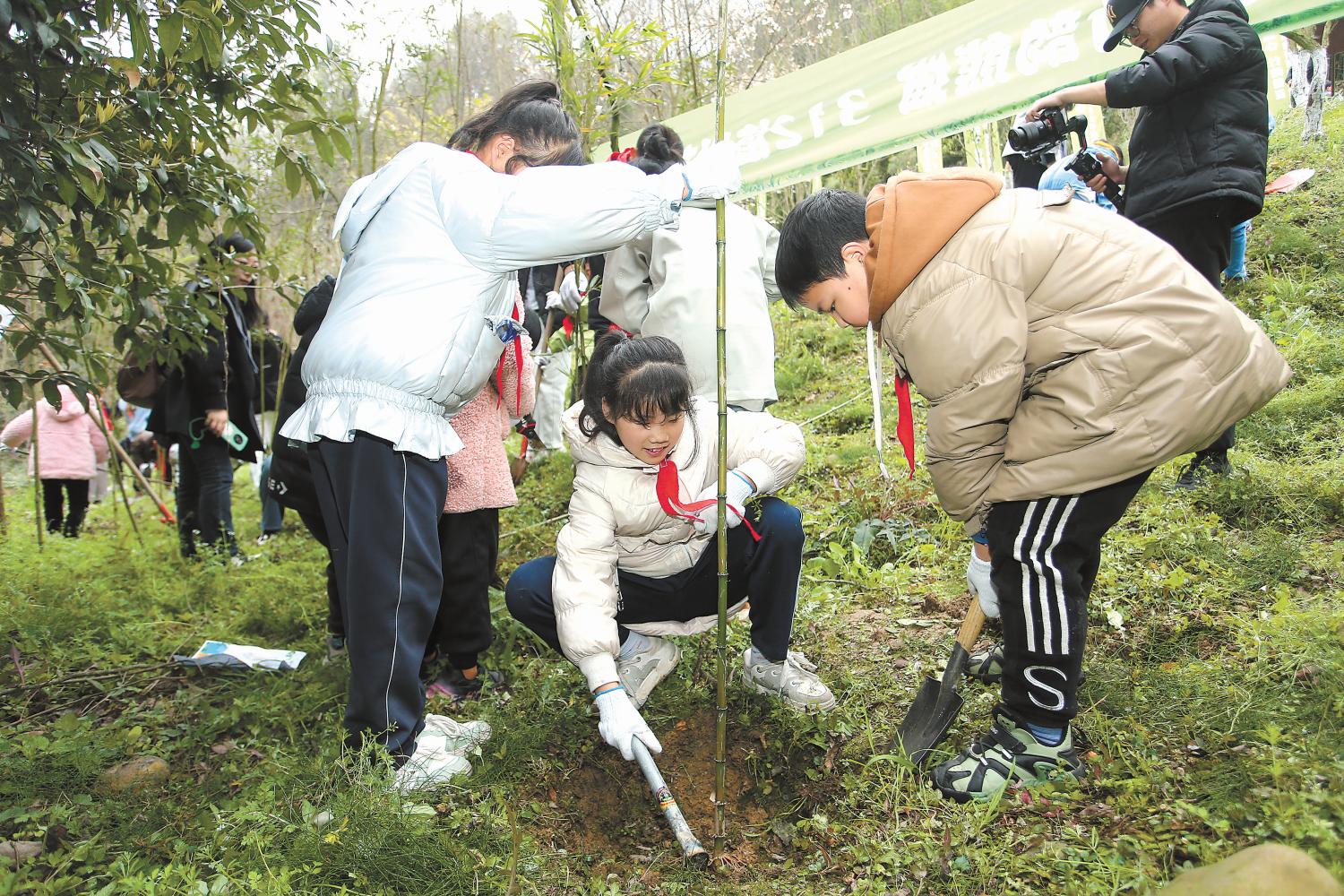 3月12日,在中国大熊猫保护研究中心都江堰基地,来自四川成都、简阳的20余名儿童动手种植大熊猫喜食竹,以实际行动参与大熊猫保护和美丽中国建设。