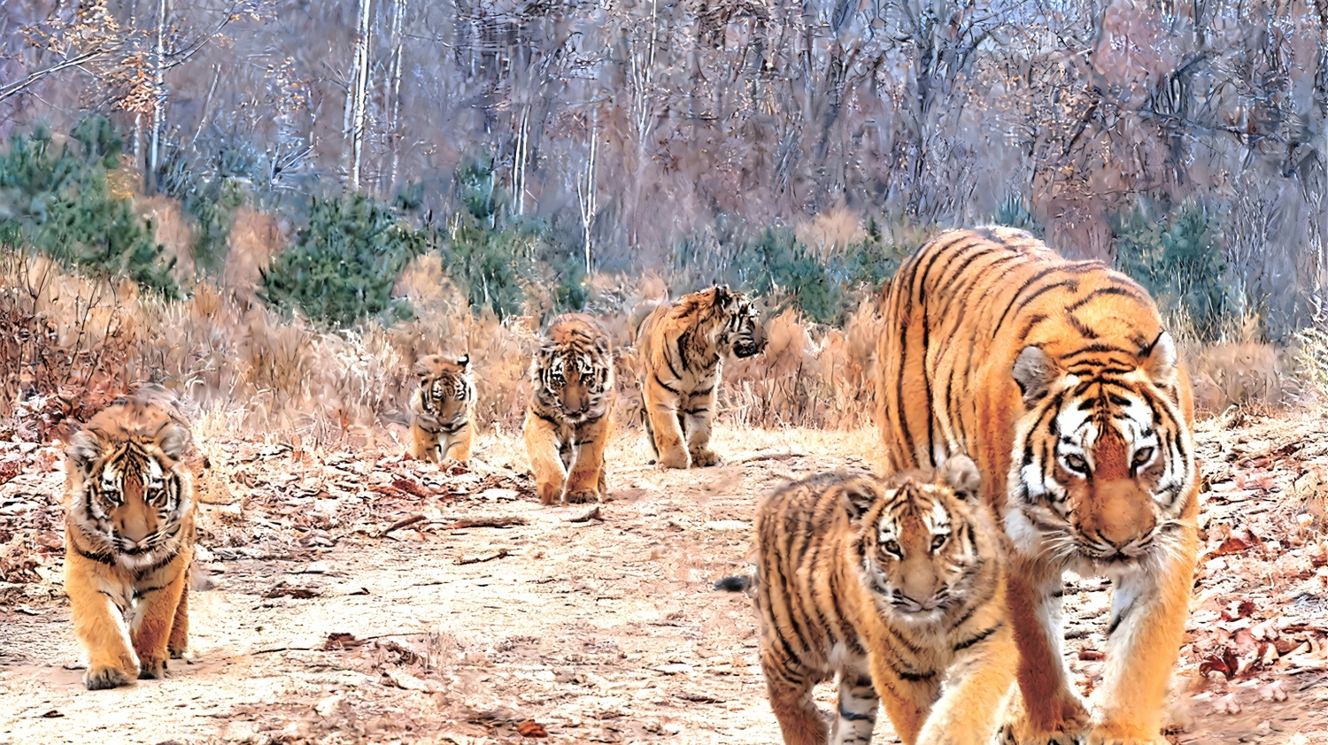 11月初,东北虎豹国家公园巡护员在值班时,接到一条触发式红外相机传回的预警信息,提示有东北虎经过。巡护员立即打开手机中的实时监控软件,画面中,1只野生东北虎母虎带5只幼崽,出现在东北虎豹国家公园珲春保护地。这是我国首次野生东北虎“六虎同框”的影像记录。