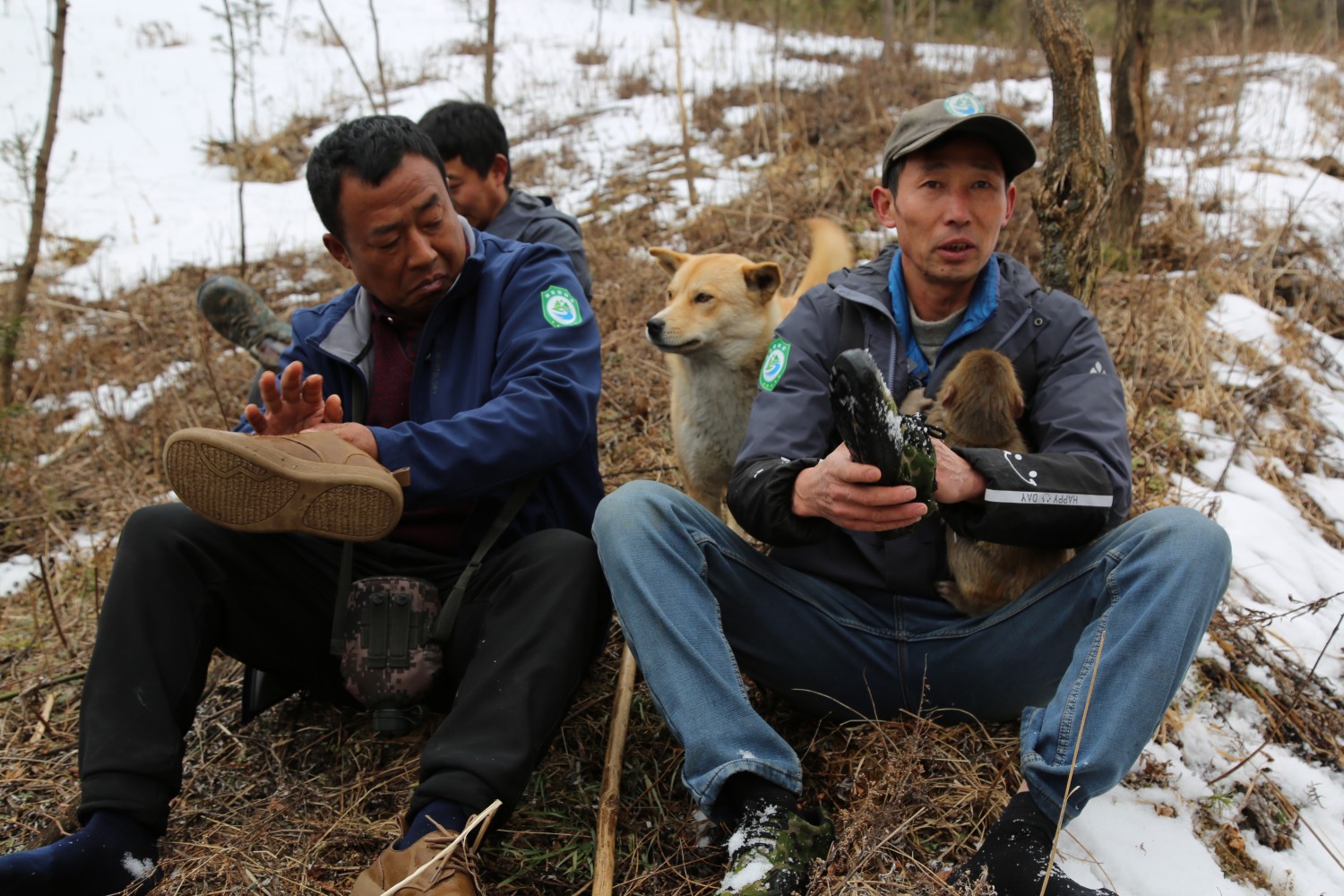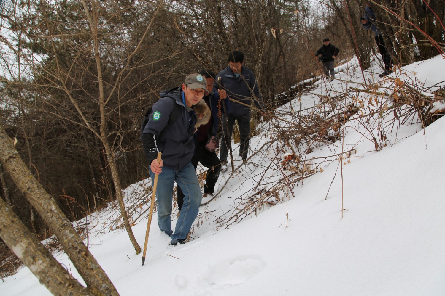 他原本是村里兽医,如今在这里一边护林,一边帮着救治受伤的野生动物。天色阴沉沉的,像又要下雪。他们继续往前走,猴健赖在谭明宽肩上,一只叫“陆虎”的黄狗在雪地里撒欢,它一时向林子深入跑去,一时又回到三人中间,吓得林子里的野生动物惊恐万分。