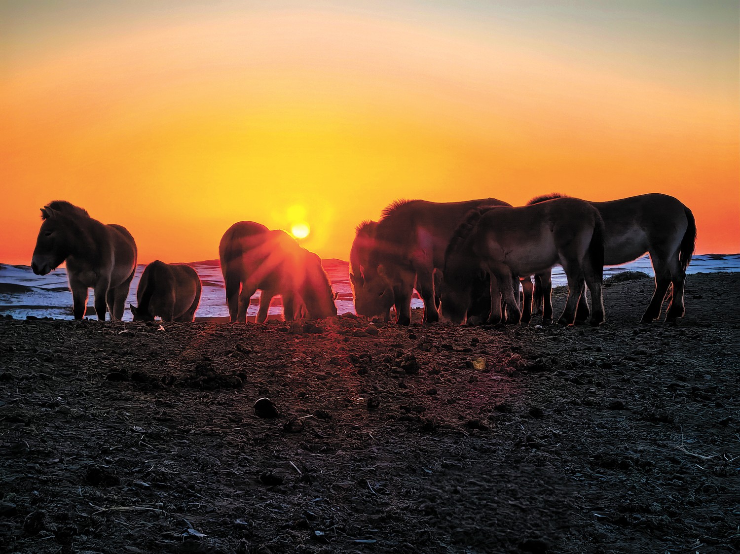 新放归的野马头领(王)“准噶尔381号”在观日出