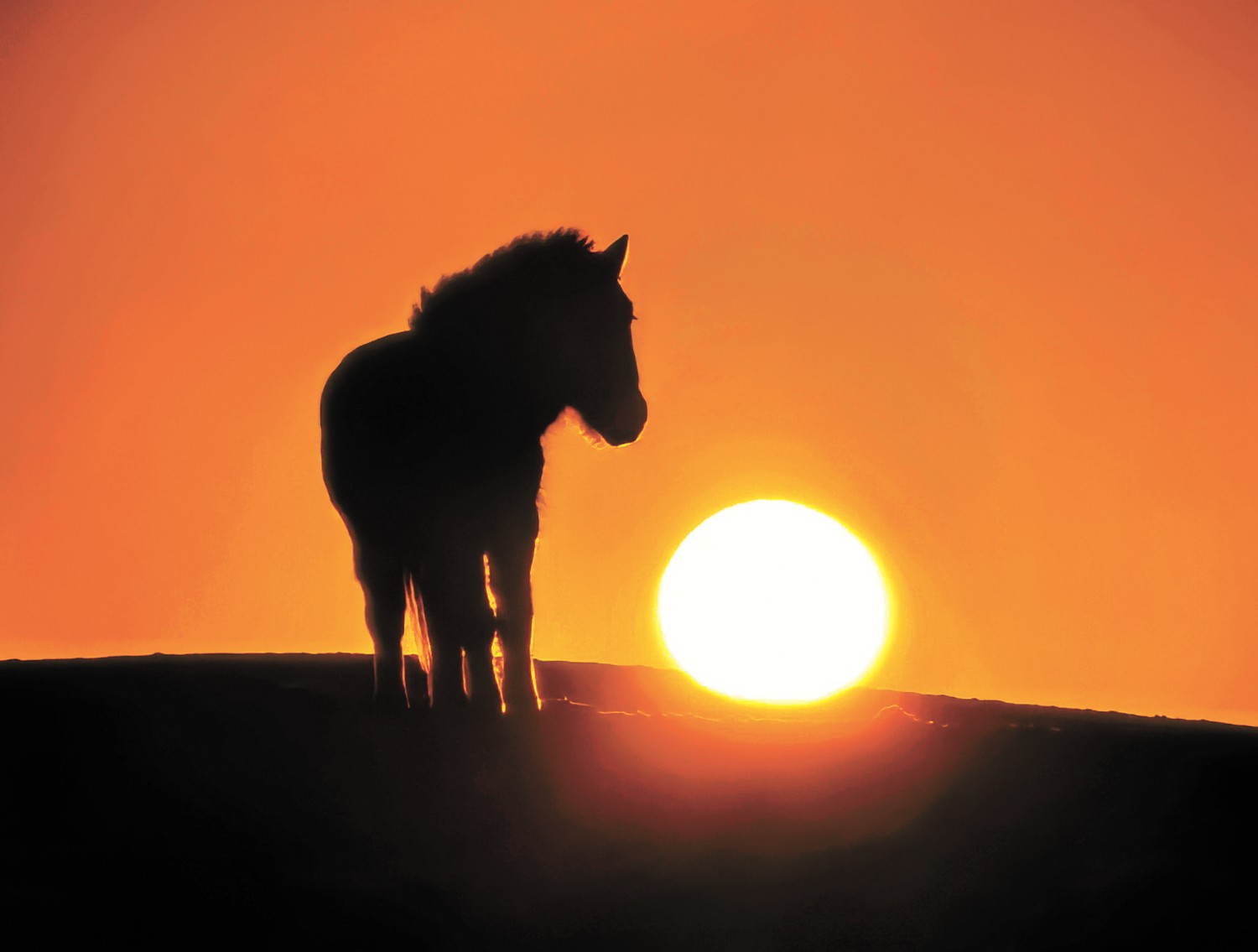 野马大都在东面的坡上,三五成群地站着。我一边走一边举起相机和手机,变换着角度,让那轮浑圆的金色太阳出现在马头、马背、马尾的不同位置——镜头里,每一帧都是一幅画,每一匹马都被镀上了一层光。