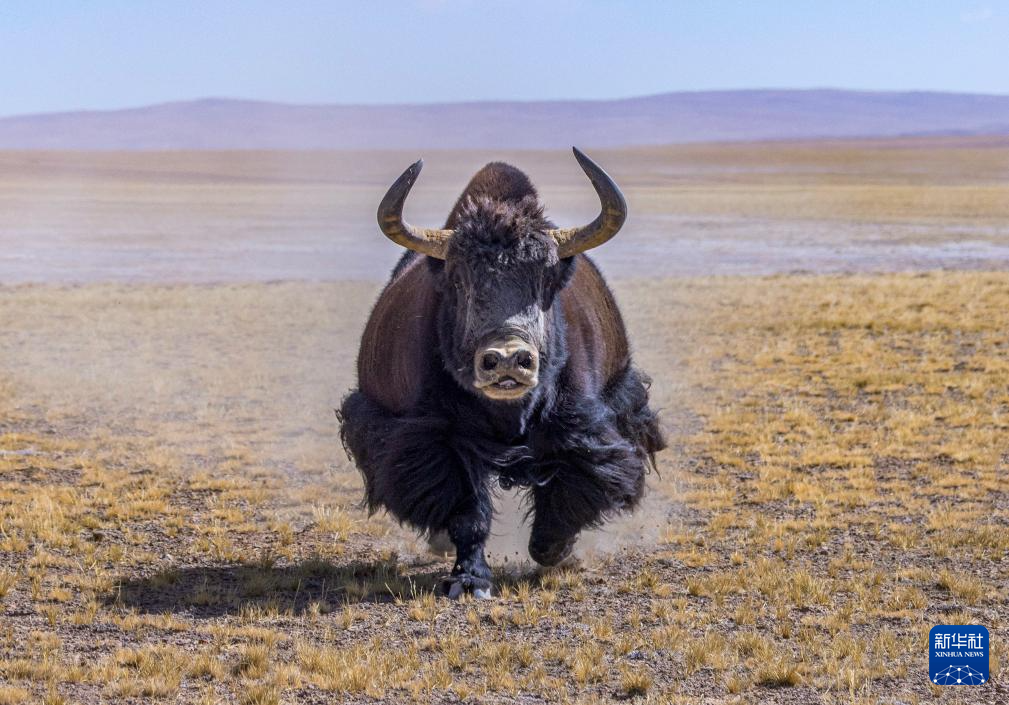 野牦牛群在藏色岗日冰川附近奔跑(无人机照片,3月10日摄)。
