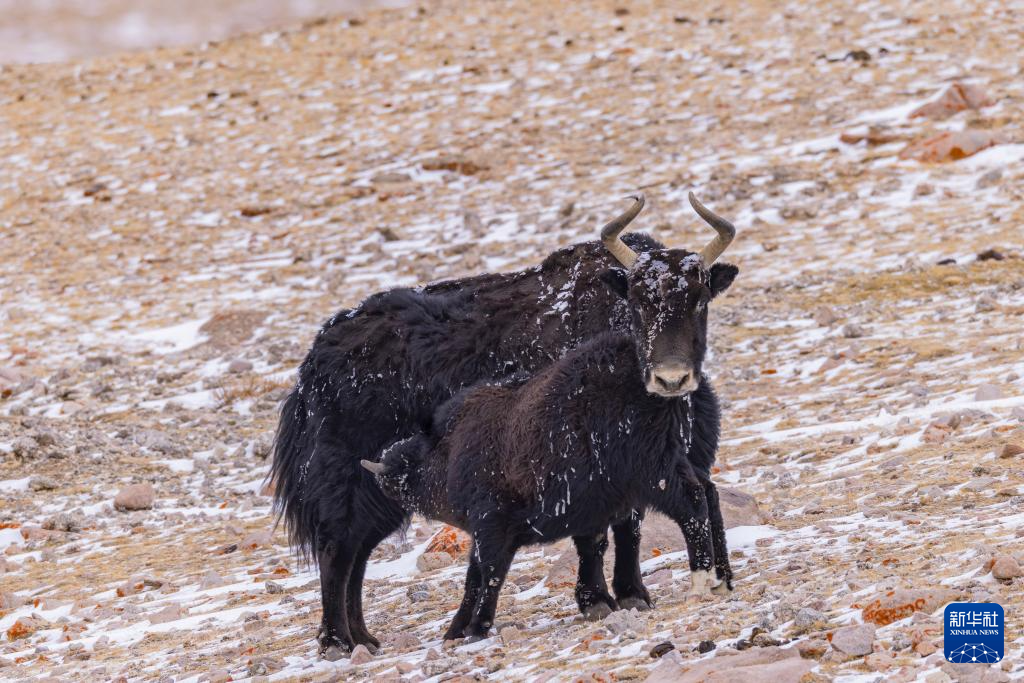 一头野牦牛犊在藏色岗日冰川附近吃奶(3月16日摄)。