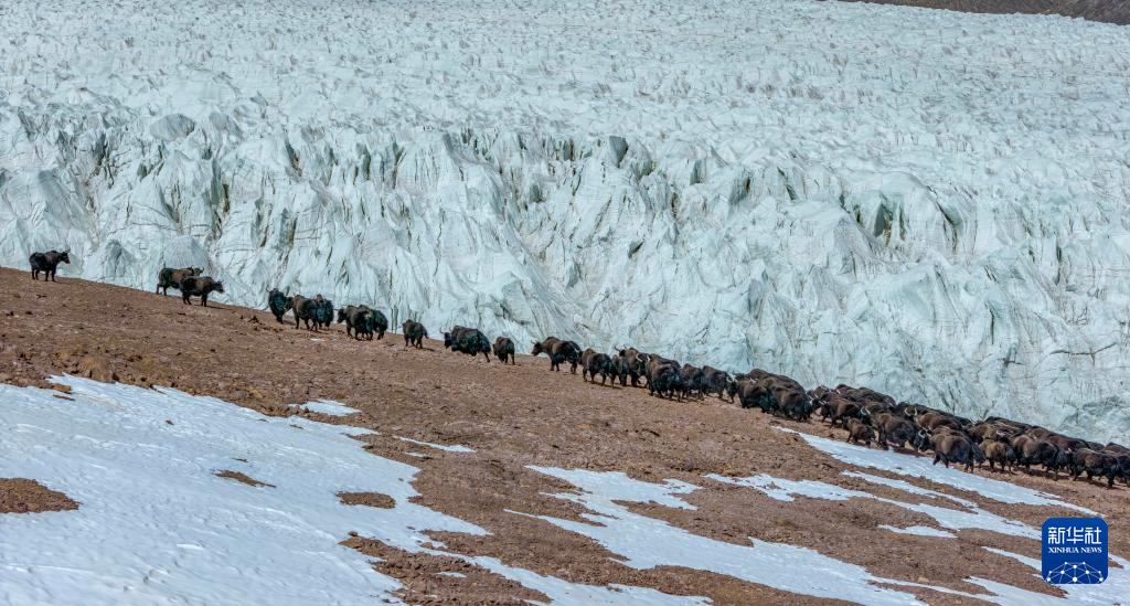 野牦牛群从藏色岗日冰川旁走过(无人机照片,3月10日摄)。