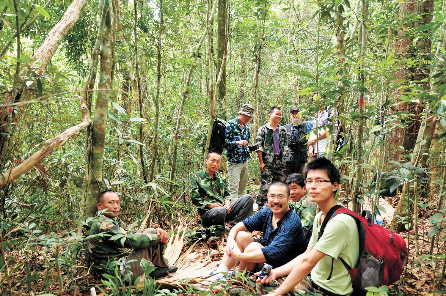 2009年,尖峰岭60公顷大样地树木调查时,测量人员午间小憩资料图。许涵供图
