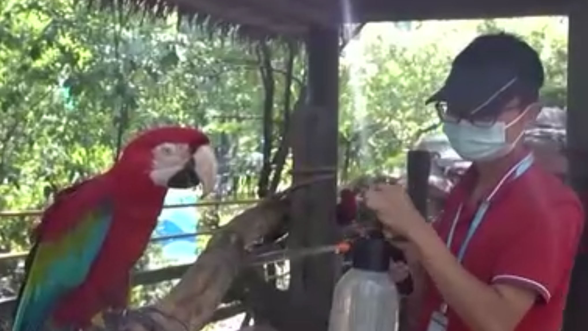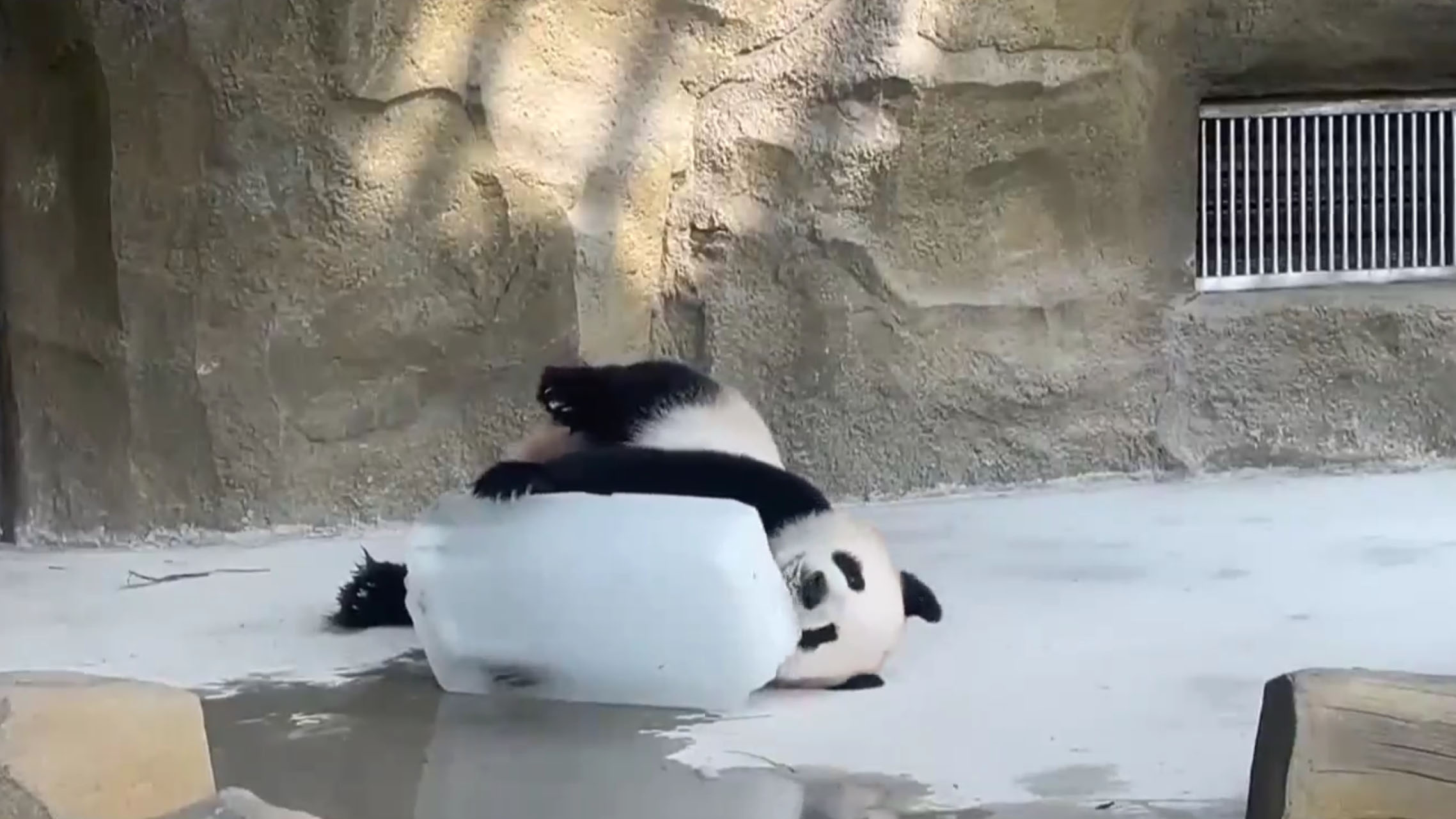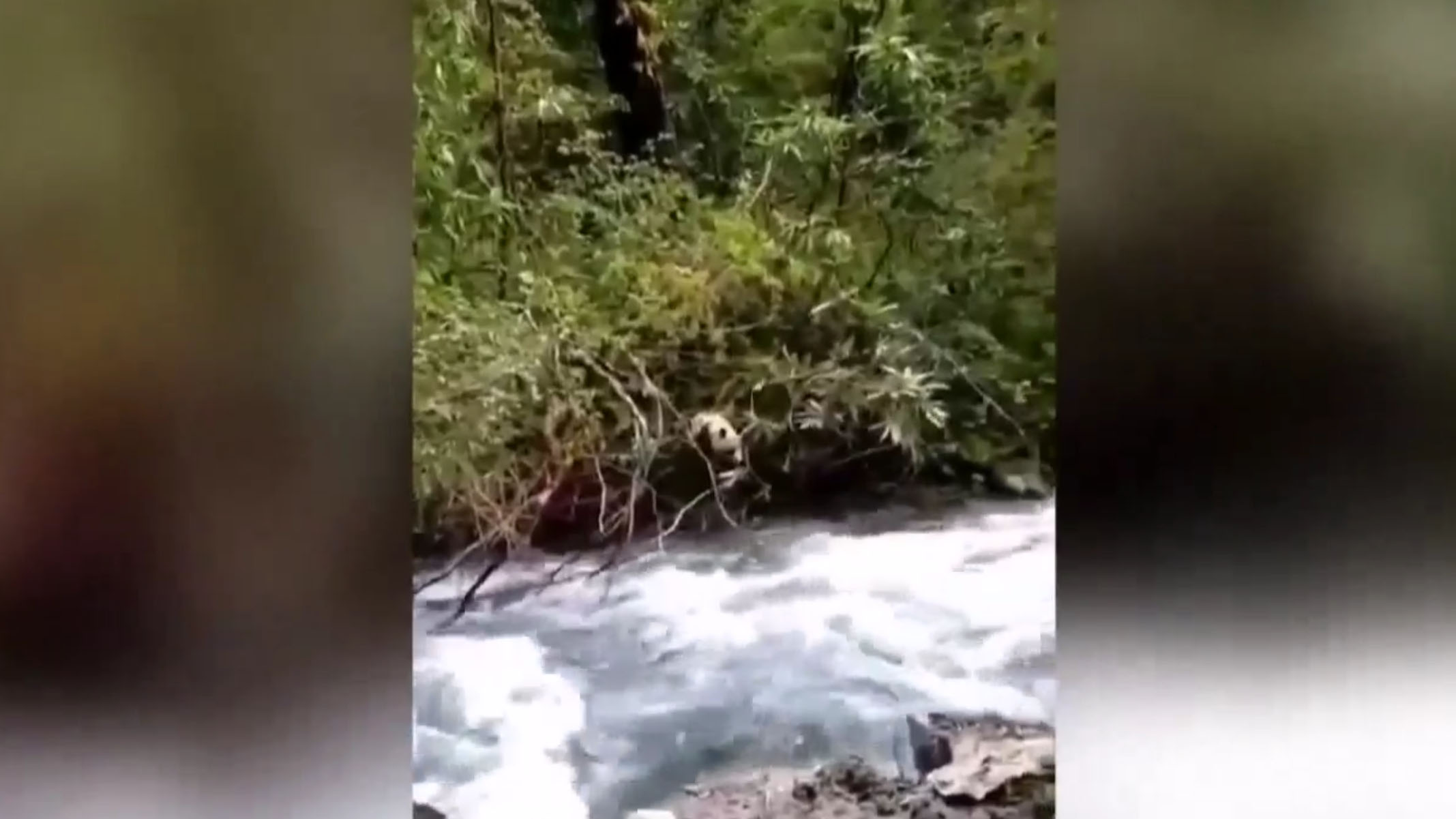 四川绵阳:大熊猫欲下山冲凉 河水湍急直叫唤