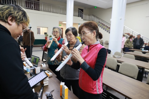 陶旭光现任北京单簧管协会会长、中国歌剧舞剧院国家一级演奏员,在管乐演奏与教学领域造诣深厚;王瀚强老师留学法国,获萨克斯专业博士学位,具有多年音乐普及与教学经验。讲座中,两位老师从电吹管音色丰富、指法通用、易于上手等特点及其对老年人的独特优势入手,系统讲解了乐器功能、操作要领与演奏技巧。讲座最后,两位老师分别运用不同音色精彩演绎了多首经典曲目,将现场气氛推向高潮。在互动环节,老同志在老师指导下亲手试奏,现场配备全新一次性吹嘴,保障卫生安全,零基础学员也能轻松体验吹奏乐趣,现场气氛温馨热烈。